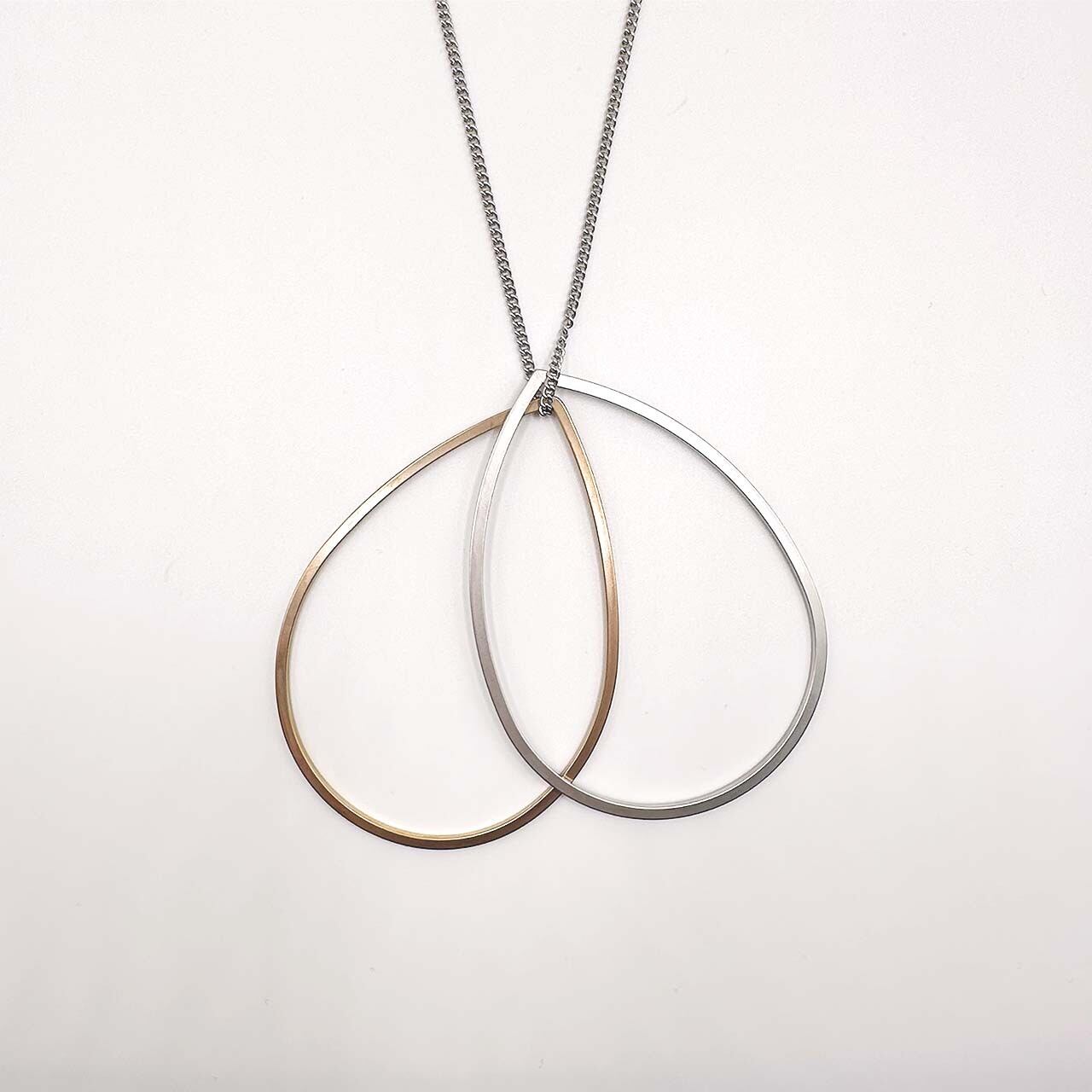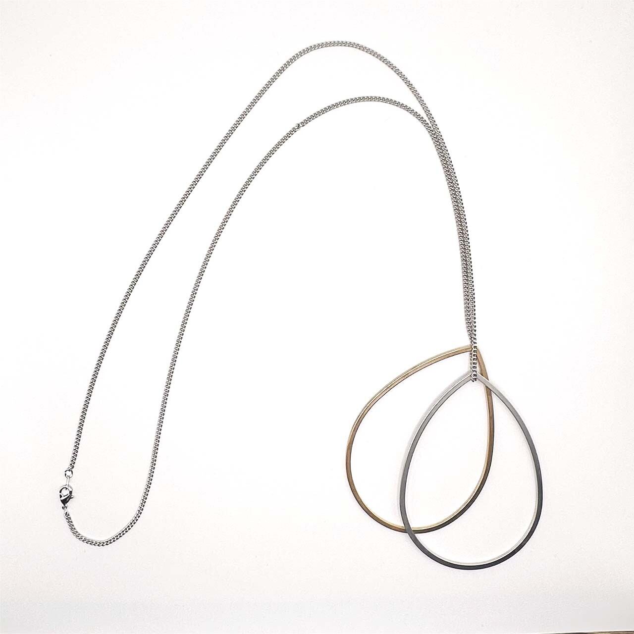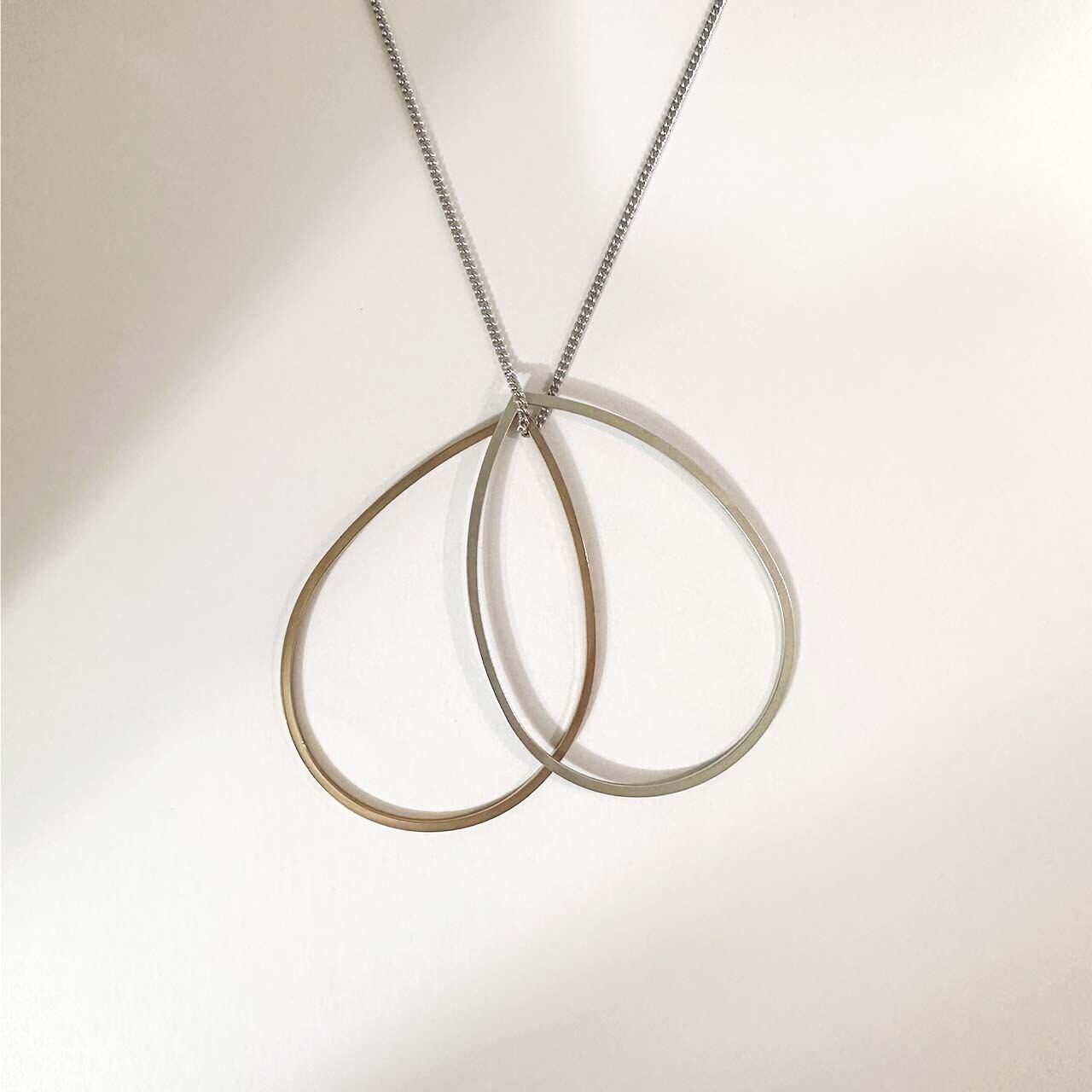 ラージティアドロップネックレスは、シンプルで洗練されたデザインが魅力です。美しいティアドロップ型のモチーフが、どんなシーンでも存在感を放ち、シーズンレスでお楽しみいただけます。シルバーとブロンズのツートンカラーが、柔らかさとエッジの効いた印象を演出します!