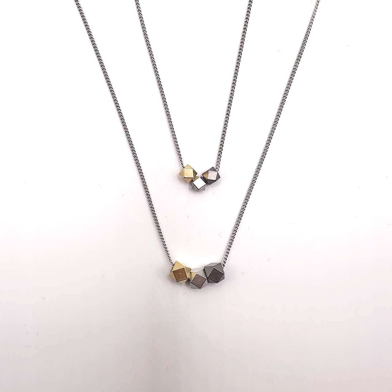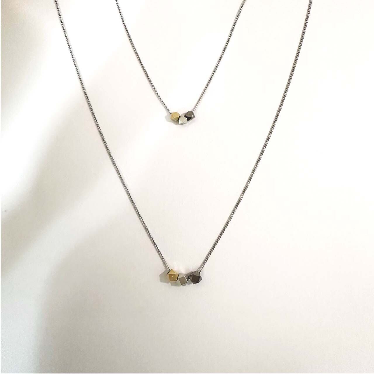 キューブネックレスは、気品あふれるデザインが魅力のアイテムです。立体的で小さなキューブがあしらわれた2連のネックレスは、華やかさとさり気なさを兼ね備え、日常使いや特別なシーンにも最適です!