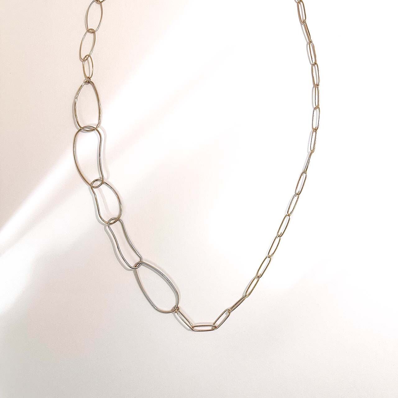 ランダムチェーンネックレスは、気品のあるデザインが光る魅力的なアイテムです。異なる3種類のチェーンを組み合わせた洗練されたスタイルは、日常のコーディネートに華やかさをプラス!フックはひっかけるタイプで着脱しやすい仕様になっています。