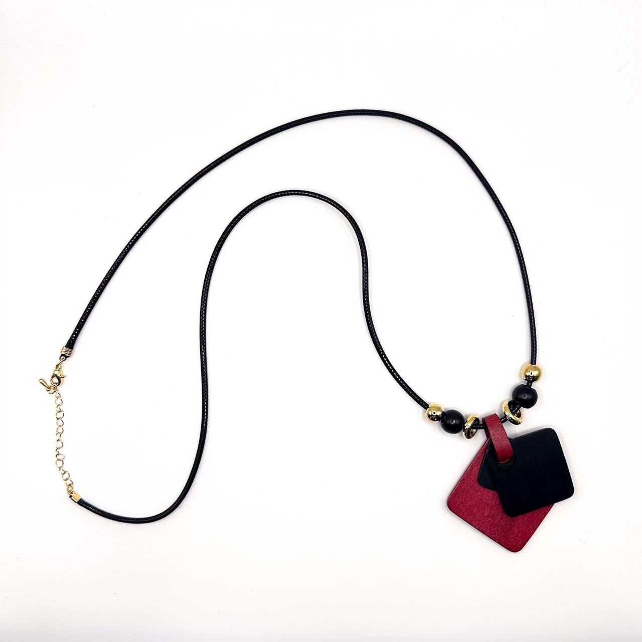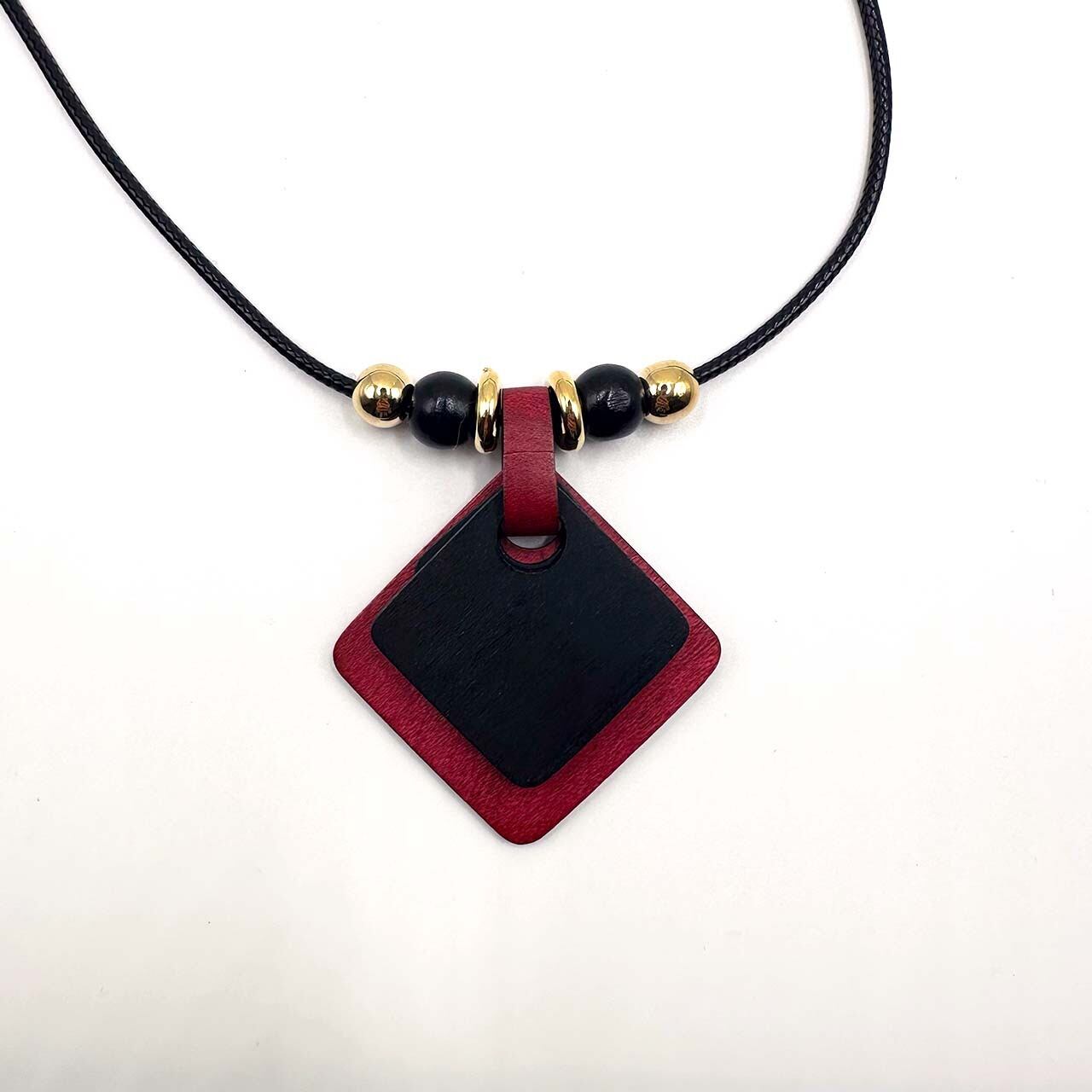 ウッドパネルネックレスは、自然素材の温かみを感じるおしゃれなアクセサリーです。重ねられたレッド×ブラックのウッドパネルモチーフが、シンプルなコーディネートの差し色としても存在感を発揮します。普段使いはもちろん、特別な日のお洒落アイテムとしてもお楽しみいただけます!